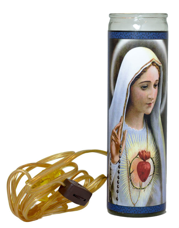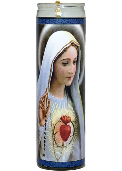 Our Lady of Fatima with Immaculate Heart. Candle includes, Prayer to Our Lady of Fatima on the reverse side.Share