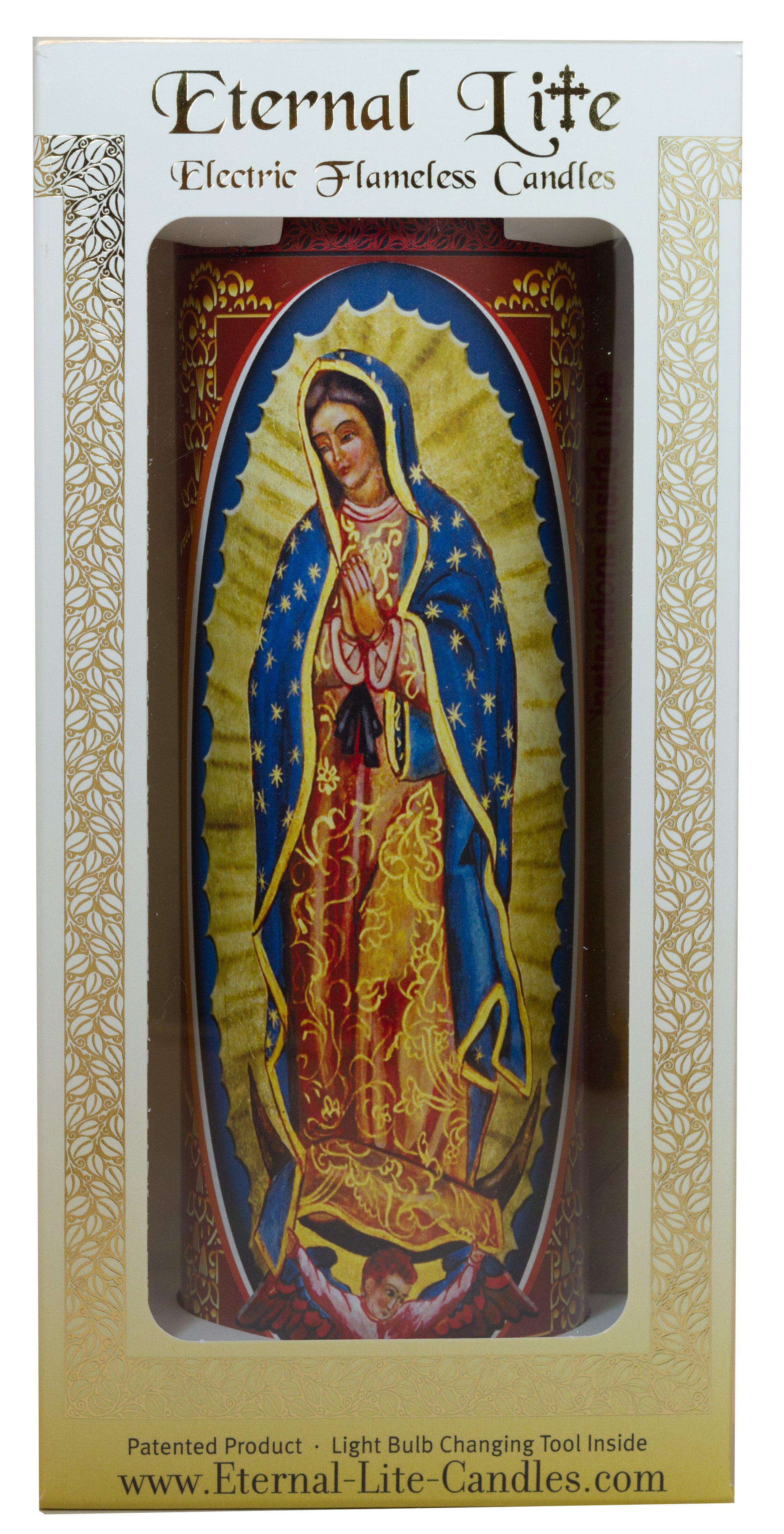 Enliven your home with a beautiful flameless candle scape featuring the incomparable Our Lady of Guadalupe! Plug in and bask in the warm light of one of the world's most iconic images. Enjoy the beauty of Our Lady's presence every evening without worrying about smoke or flames. Simply plug in and enjoy her serene aura!