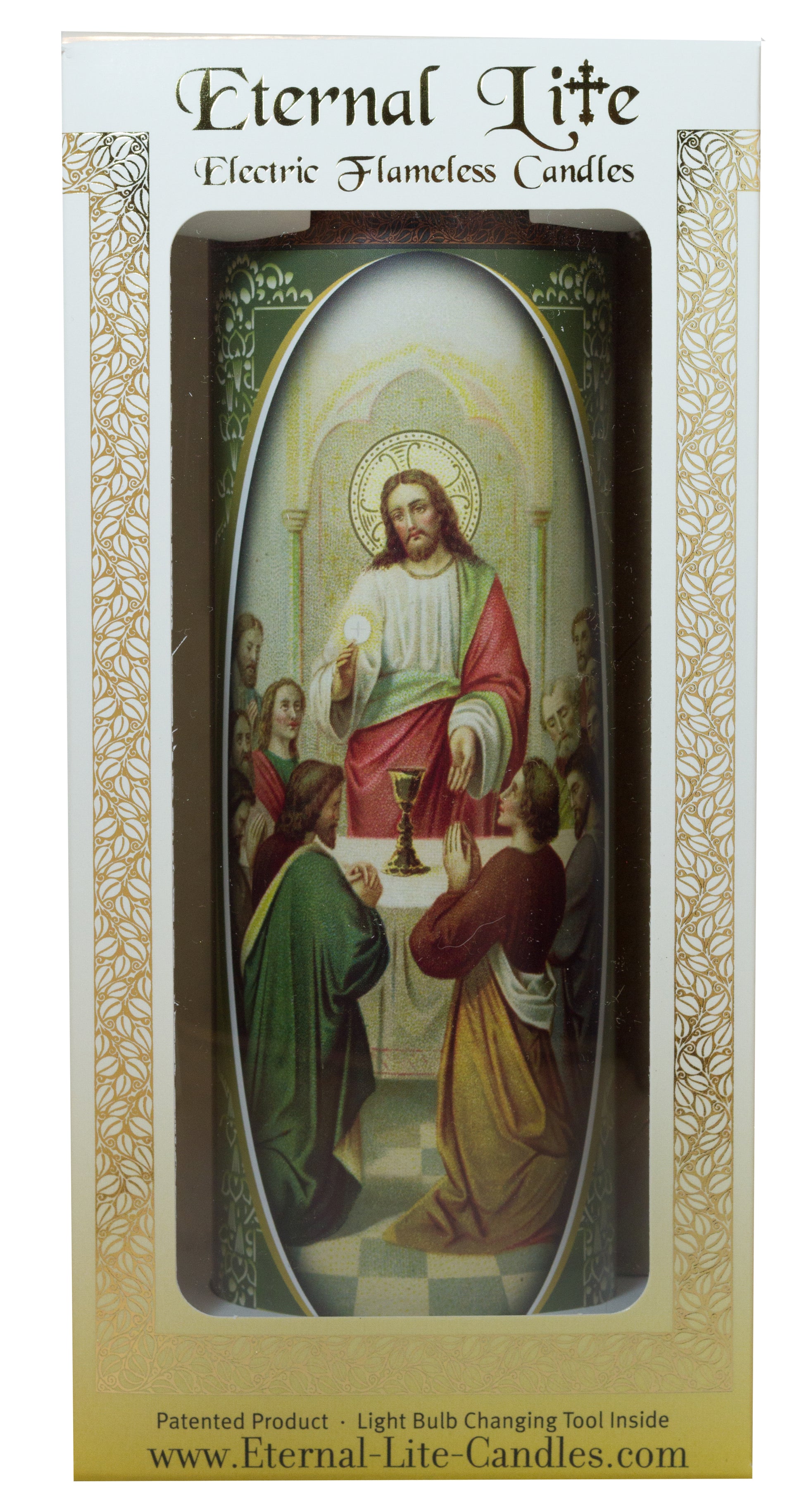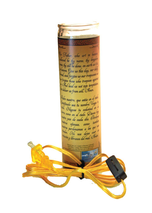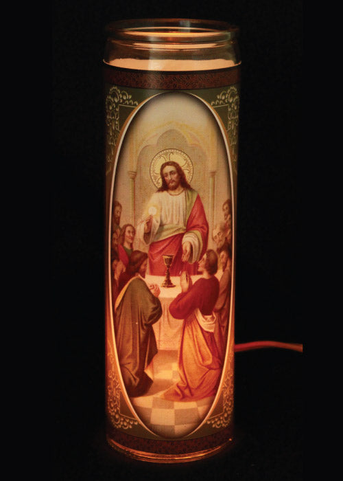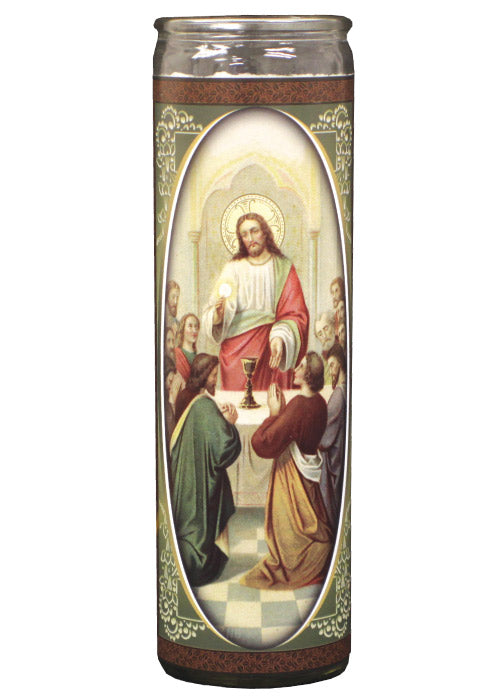 An image nearly as old as the Faith. The Last Supper will always be remembered. The warm glow of this candle is a precious reminder of how important sacrifice is in our daily lives. Jesus breaking bread with his 12 disciples and on the reverse side,”Our Father” in English and Spanish with brown and green hues.